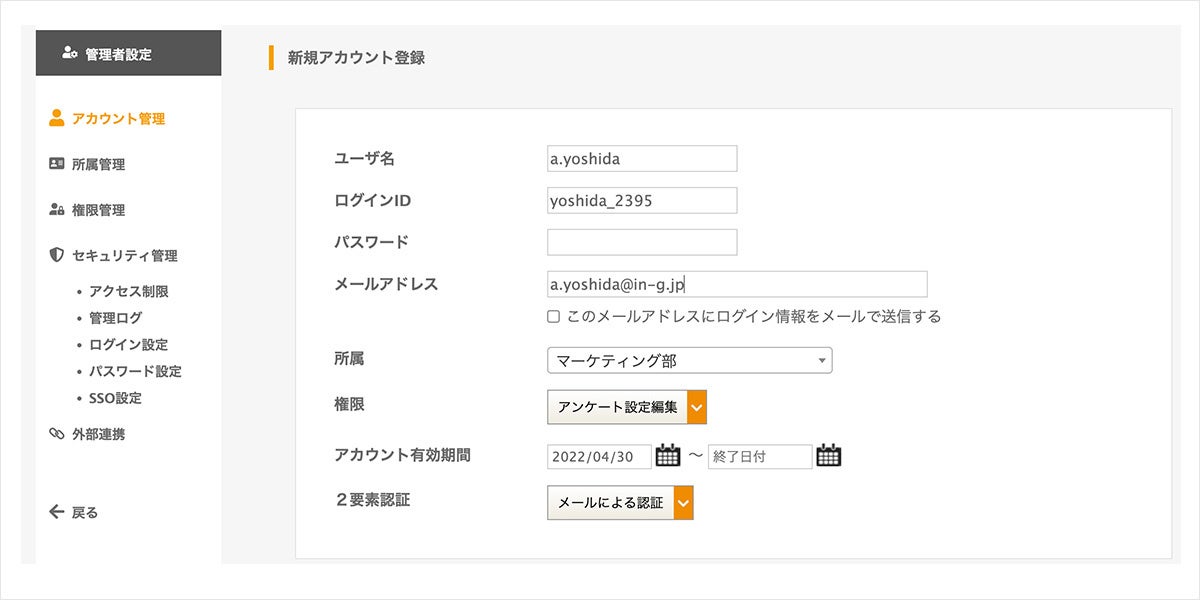 所属と権限を設定してユーザを作成することができます。1つの所属ごとにユーザは10人まで作成することができます。