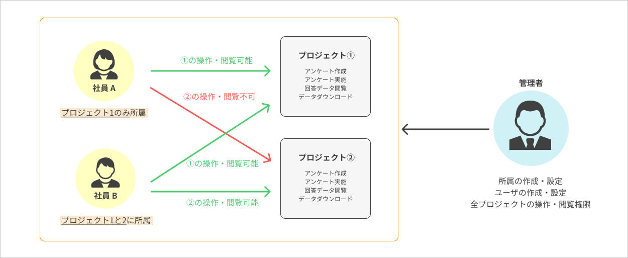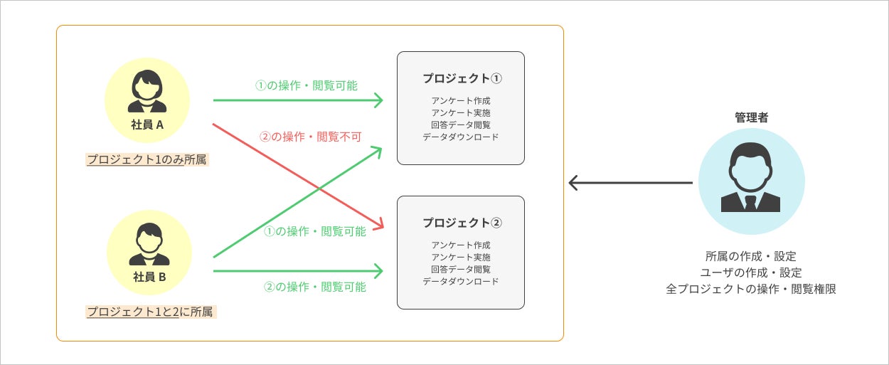 - プロジェクトAに所属で「アンケート作成」のみできるユーザ