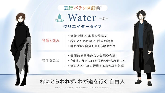 画像に記載された「Water(クリエイタータイプ)」などの表現は、特にその気質が強く表れている場合の特徴を示したものです。実際の診断では、5つの気質すべての配合比率をもとに総合的に分析します。この「配合比率」こそが、その人の“個性”であり、同じ構成を持つ人は存在しません。