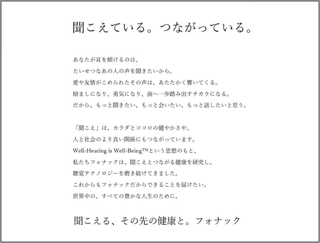 たいせつな人の声を聞いたときには、前へ一歩踏み出すチカラが湧いてきます。「良い聞こえ」でカラダとココロの健やかさ、人と社会のより良い関係につなげ、すべての人の人生を豊かにしたい。