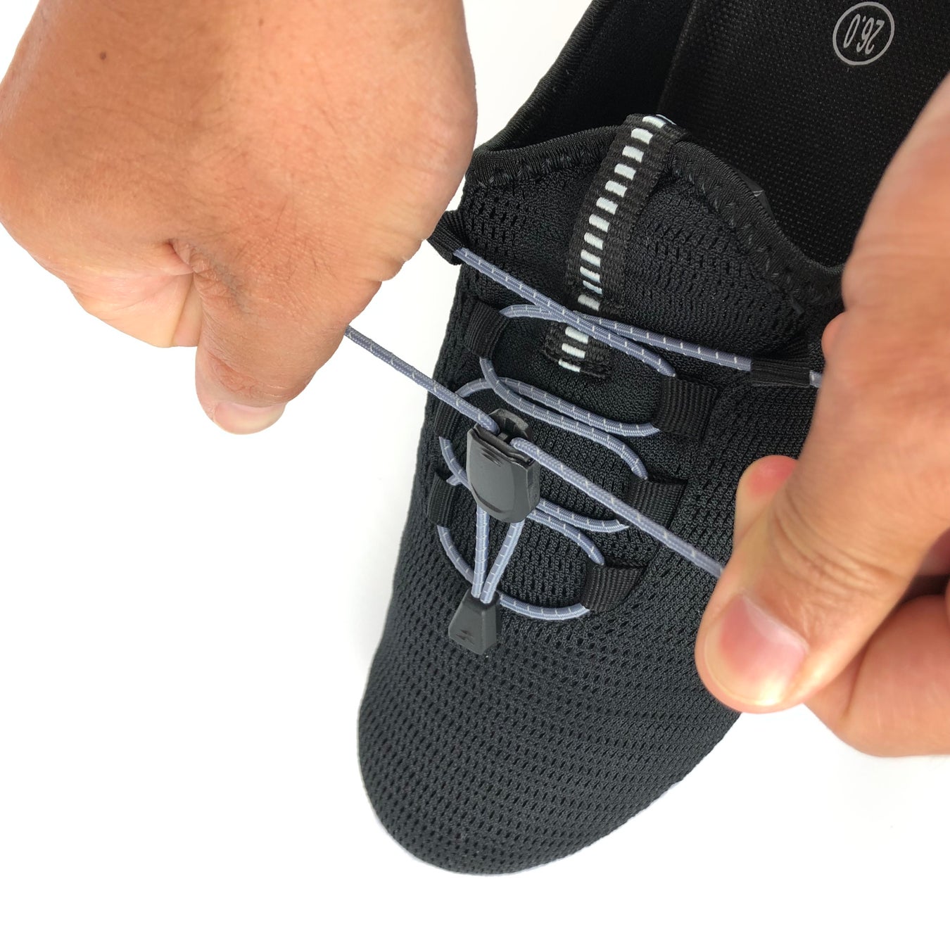 また、ゴム紐の伸縮性をいかして、紐の余り部分も好みのフィッティングやシューズデザインに合わせてご自身で調整可能です。