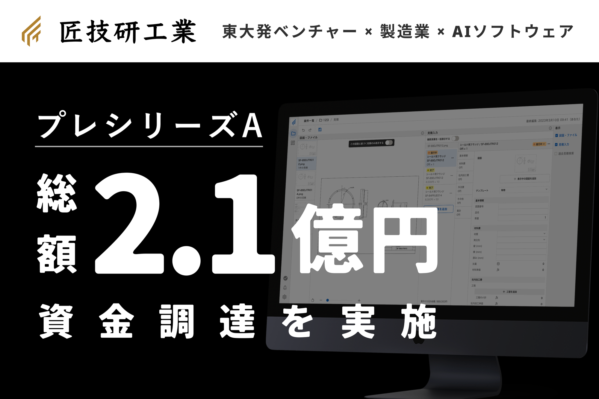 製造業向けAI見積支援システム『匠フォース』を提供する東大発ベンチャー、匠技研工業が総額2.1億円の資金調達を発表。