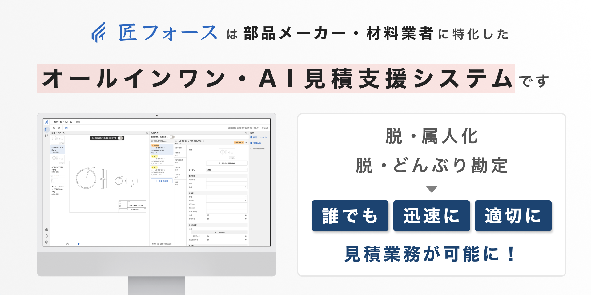 日本の中小製造業の現場を100社以上訪問する中で浮かび上がってきた「見積業務」の根深い課題に着目し、2022年9月に「匠フォース」をリリースいたしました。