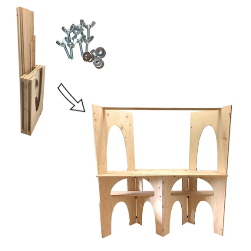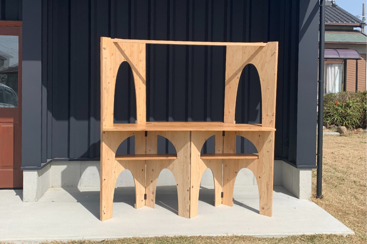 Patto(パッと)は、奥三河の間伐材を活用したその名の通りパッと組立てられる屋台です。持ちやすさと組み立てやすさを考慮し、蝶番を用いてパタパタと折りたためる構造。約5分で工具を使うことなく組立て若しくは撤去でできます。