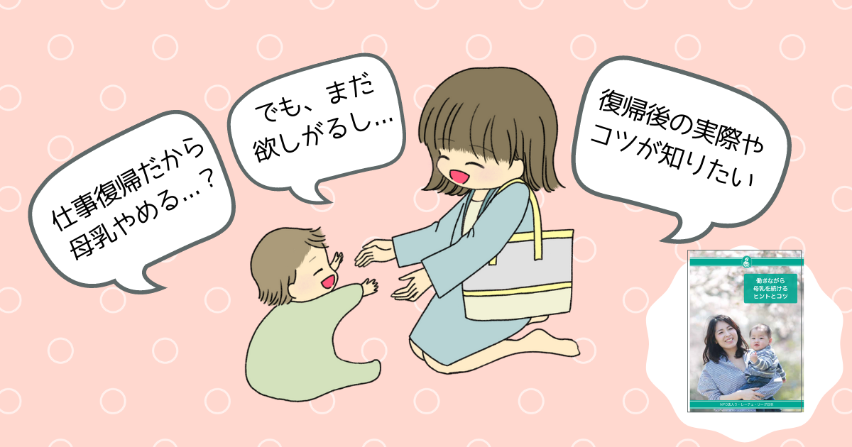仕事に復帰するお母さんたちからは、「母乳をやめなければいけないと思っていた」という声をよく耳にします。一方で、復帰前後で変わらず母乳を続け、そのメリットを実感している人もたくさんいます。仕事、家族、そして授乳の状況は人それぞれです。復帰後の生活を考えるときには、母乳を続けた場合の生活のイメージや、続けやすいコツも知った上で、それぞれが自分たちに合うものを選択できるように。そんな願いから、この冊子ができました。
