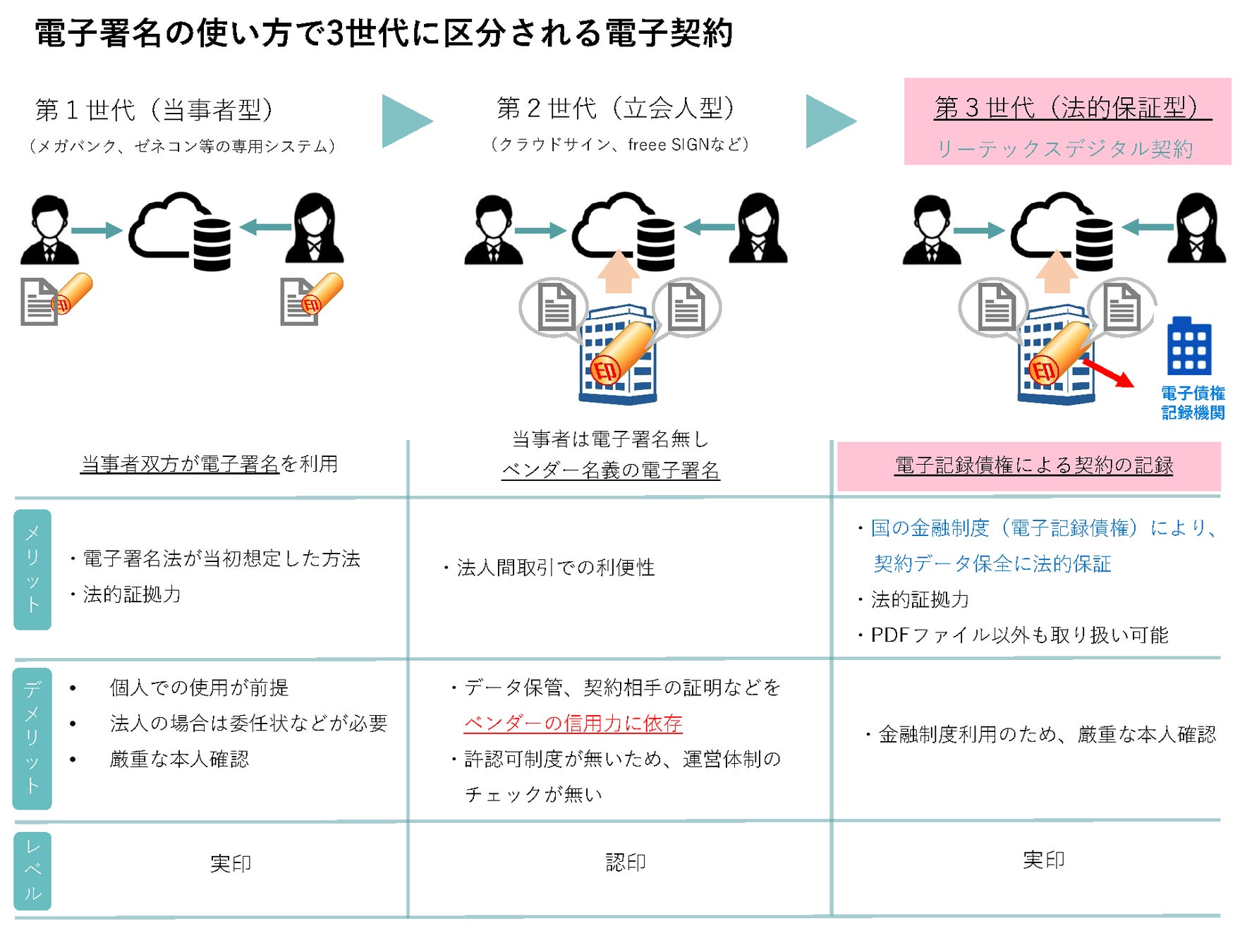 「Tranzax社の創業者小倉隆志氏が創設した、OGU-Techs株式会社のシステム特許にかかるリーテックスデジタル契約®というものだが、電子契約について、(同社の電子署名に加えて)電子記録債権を使って、その真正性を担保するものである。小倉氏は、これを電子契約の第3世代の法的保証型(電子記録債権併用型)と表現している。具体的には、当該契約から発生する債権を電子記録債権とし、かつその記録に、当該電子契約書を参考記録としてすべて記録してしまい、電子記録債権の真正性担保機能(および確実な保存機能)を活用する、という方法である。」(「債権譲渡と民法改正」池田眞朗著P.508~509)