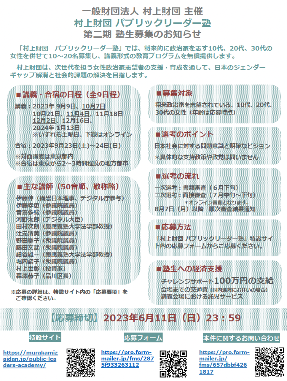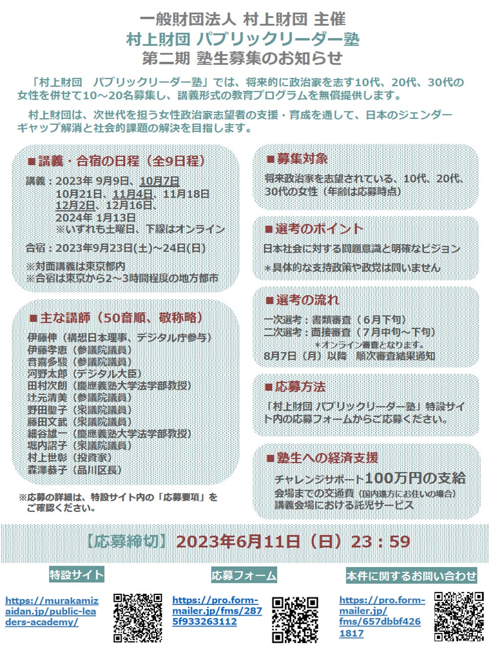 【村上財団】政治家を目指す女性たちのための「パブリックリーダー塾」