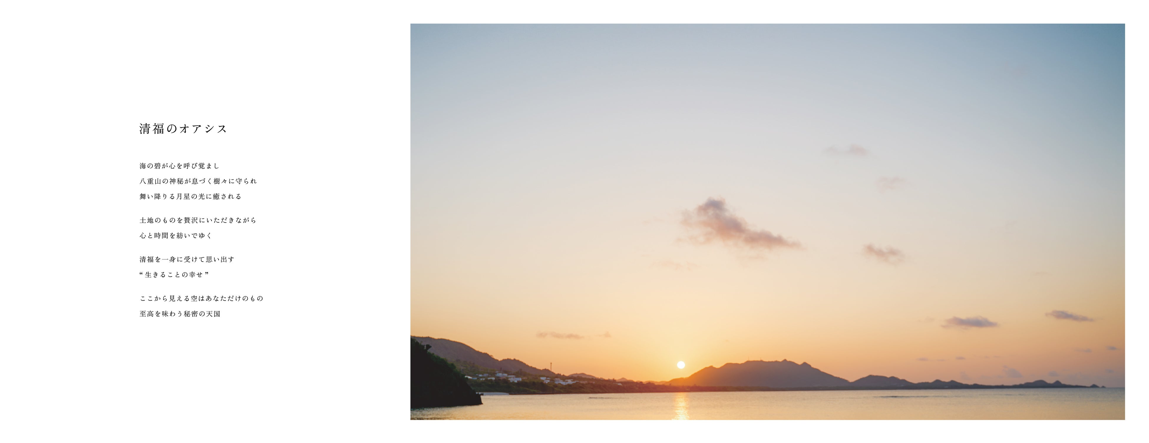 「清福で満ちたオアシス」をコンセプトとし、自然と一体化し感性を研ぎ澄ます至高空間で大切な人と過ごす贅沢な時間を提供します。