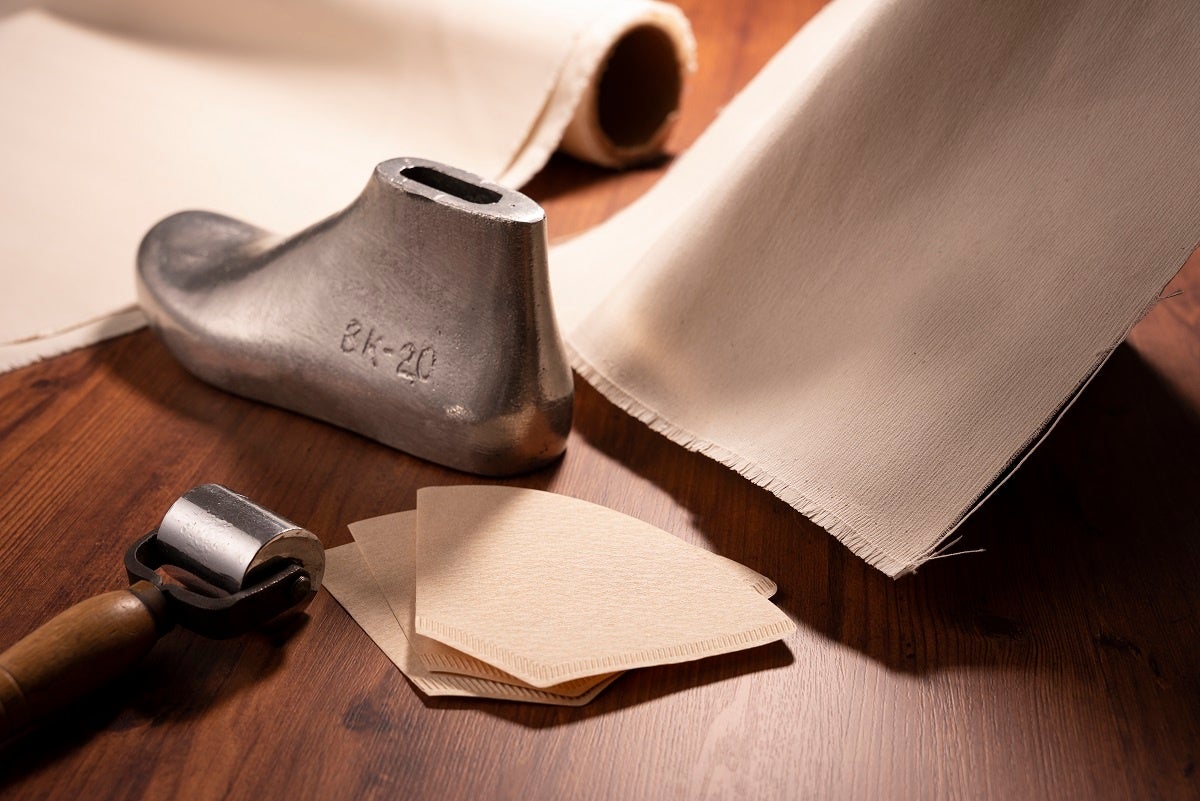 さらに新たなテキスタイル、Cafetex®が開発されました。この独特のコシのある爽やかな感触の生地の原料は何とコーヒーフィルターの製造工程の廃材。もちろん植物性です。