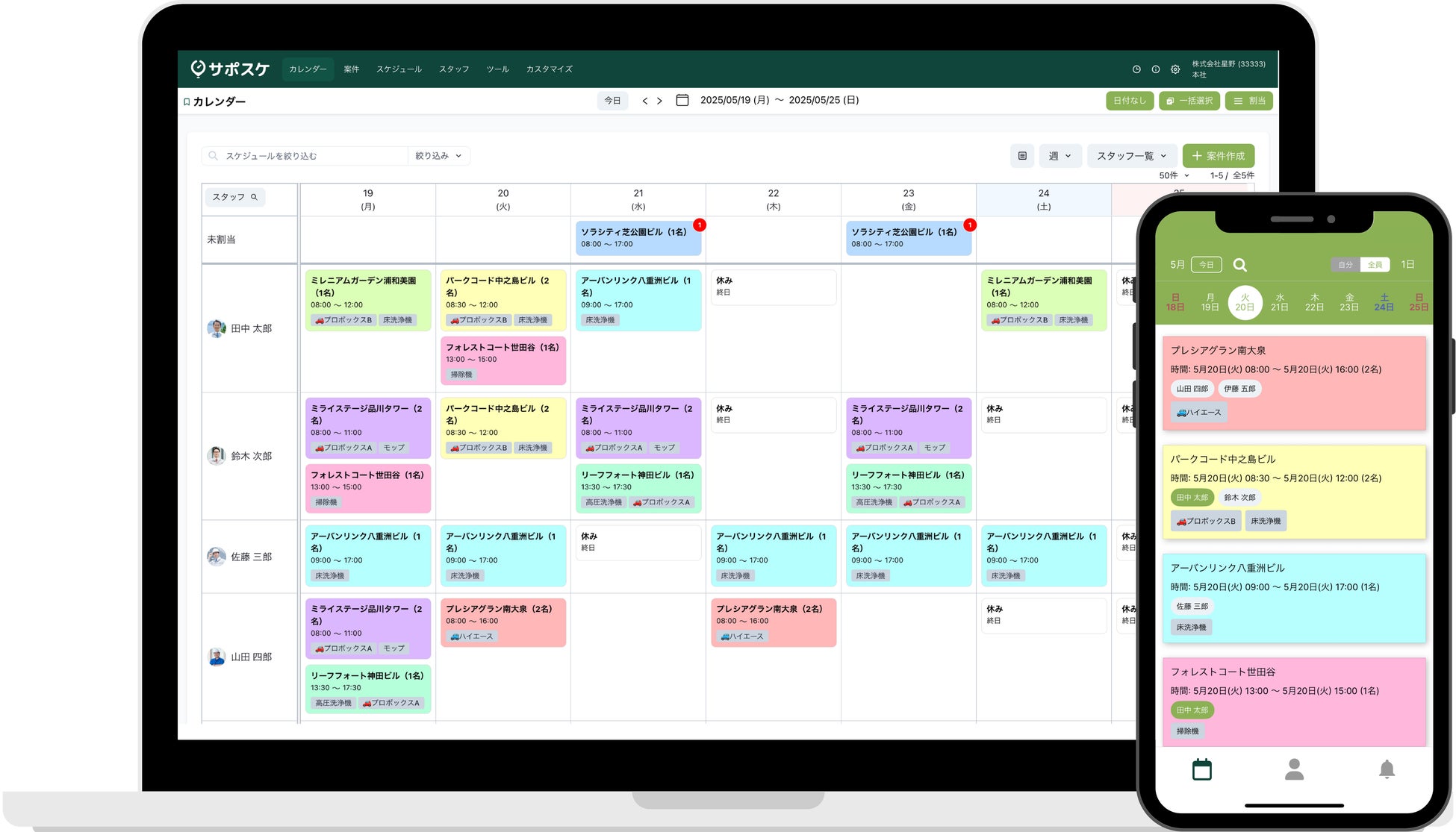 サポスケは管理者がスタッフの予定を決めている企業を中心に、ビルメンテナンス・建設・工事・訪問看護/介護などの現場仕事を主業とする業界で導入されている現場向けのスケジュール管理クラウドです。管理者がスタッフの予定を組む際に、従来Excelやホワイトボードで行われていた煩雑なスケジュール管理・共有を、シンプルな操作で効率化します。スケジュールを最適に運用することで、限られた人員でより多くの業務をこなせるようになり、業務効率化と売上向上を同時に実現。導入企業は300社を超え、現場で働く人々の生産性向上と働き方の改善を支援しています。