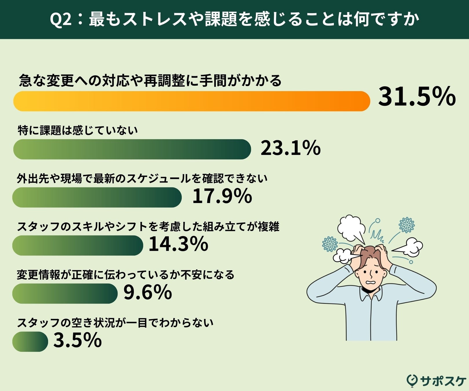2.スケジュール管理において、最もストレスや課題を感じることは「急な変更への対応や再調整(31.5%)」