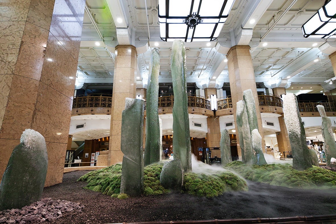 - 重要文化財 日本橋高島屋1階正面 ホールに出現した、リサイクルびんから生まれたオブジェが屹立するアート空間「一瞬に煌めく永遠 ガラスアートの瞑想空間へ」(2017 年)