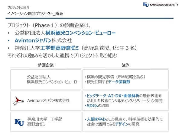 本プロジェクトでは、神奈川大学、公益財団法人横浜観光コンベンション・ビューローをはじめとした横浜市の産官学が一体となって、持続可能な観光の実現に向けたプラットフォームの開発を推進していきます。今後、様々な業界から約50の機関・団体との連携を目指します。