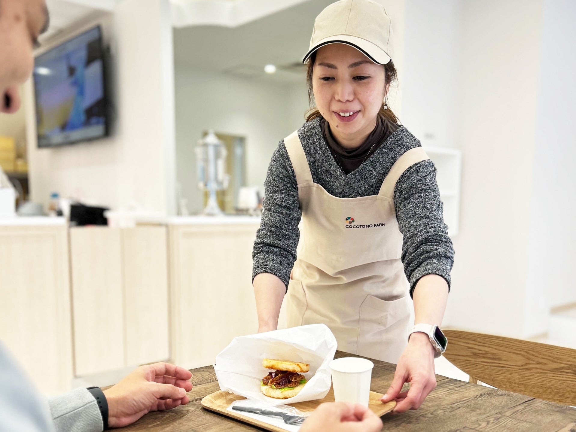 就労移行支援・就労継続支援B型事業所「ココトモワークス」ではグループ会社ココトモファームと連携し、米粉のバウムクーヘンの試食販売やライスバーガーの製造をはじめバウムクーヘンの原料となるお⽶作り等の農作業、併設のカフェや周辺にはキャンプ場など多様性のある作業・訓練で、一人ひとりの特性に合わせ活躍できる場を提供していきます。