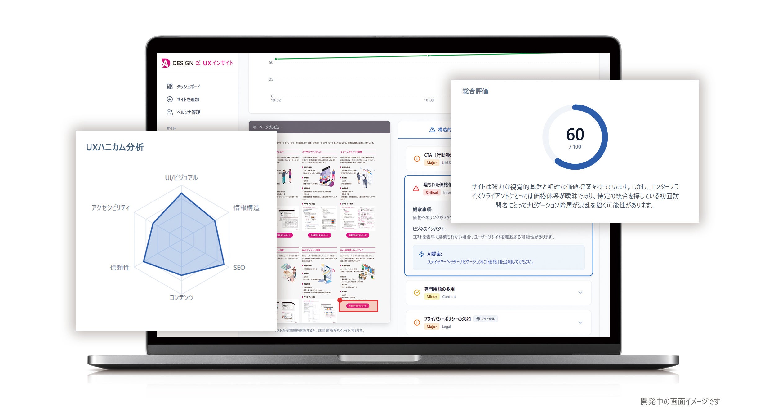 「どこを改善すべきかわからない」「調査に時間もコストもかけられない」そんな課題を解決するため、DESIGN αは、AIによるUI/UXの分析ツールを開発中です。