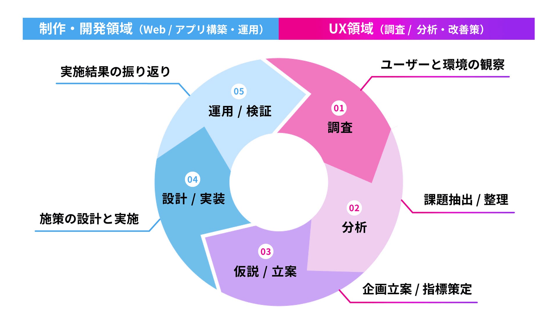 UXの専門家がデータに基づいてユーザーの行動と心理を読み解き、事業課題に即した改善策をプランニング。調査・分析・レポートに留まらず、制作・開発部門との連携により、成果に直結する具体的な改善提案まで一貫して支援いたします。