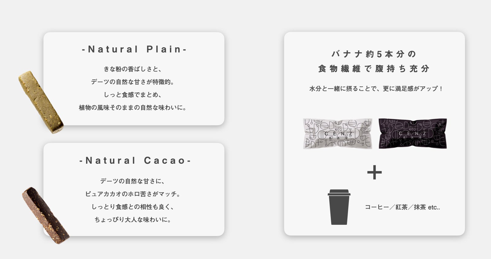 CENZ BARは、私たちが生きていくために必要とされる必須栄養素を全種類含む食品、「完全栄養食」です。「人にも優しく、地球にもやさしくありたい。カラダも、地球も、本来の姿に。」というコンセプトの元に誕生した、植物性100%の完全栄養食です。 パクっと食べれるバータイプのCENZ BARは手間いらずで、いつでも、どこでも食べることができます。バナナ約5本分の食物繊維も含まれているため、お好みのお飲み物と合わせて摂取することで更なる満足感も得られます。