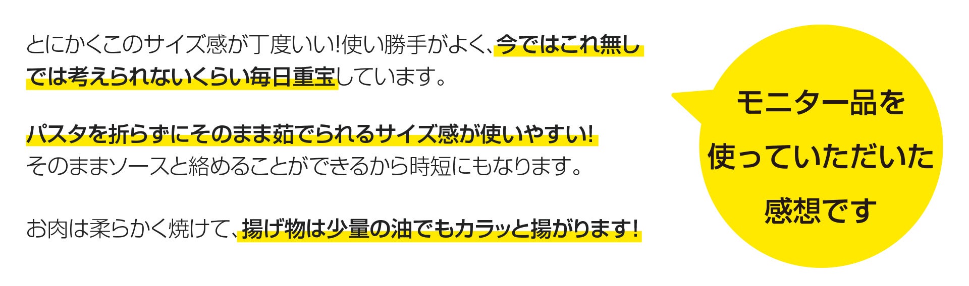 3:これひとつで色んなお料理に使える、直径26cm&深型タイプ。パスタを折らずにそのまま茹でることができる、ワイドなたっぷり設計です。