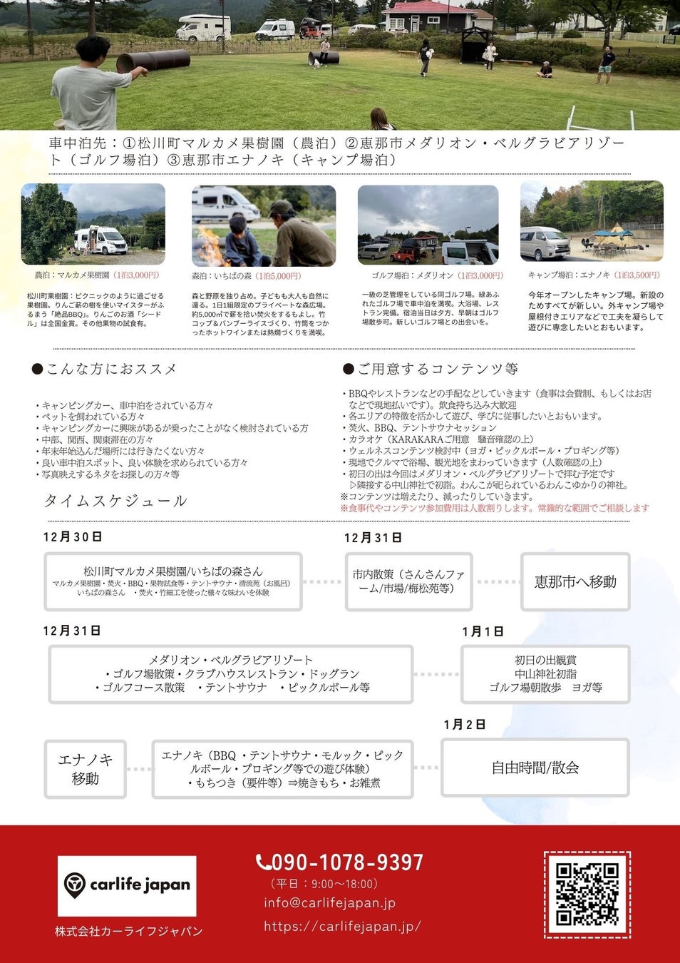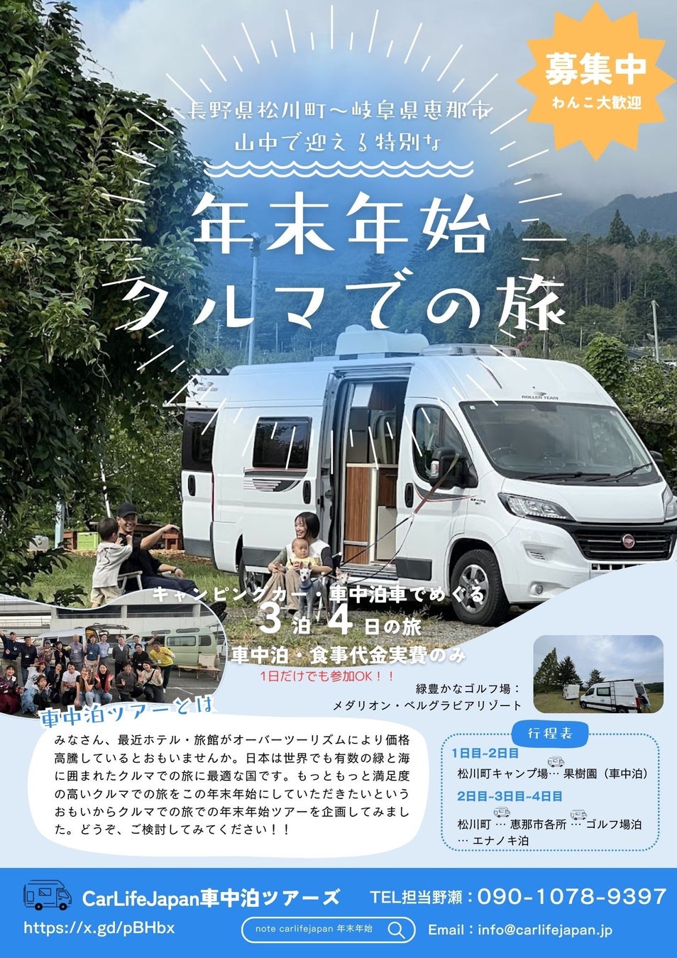 株式会社CarLifeJapan(本社:東京都、代表取締役:野瀬勇一郎)は、年末年始の特別企画として、自然豊かな長野県松川町、岐阜県恵那市を巡る「年末年始クルマでの旅ツアー」を2024年12月30日より開催いたします。本ツアーは、車中泊を通じて地域の魅力を体験し、参加者同士が交流を深めながら新しい年を迎える、新しいスタイルの旅をご提案するものです。