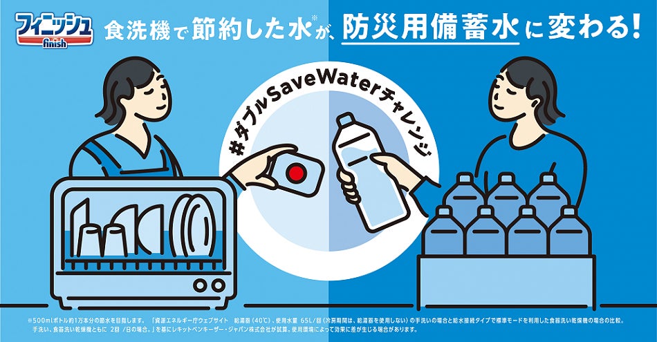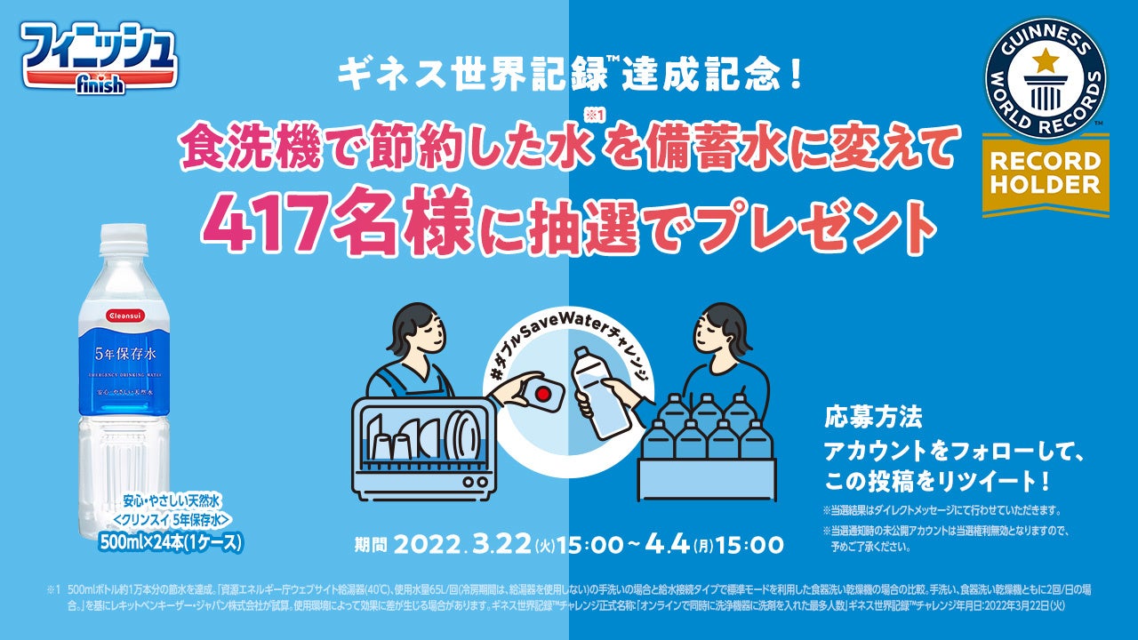 レキットベンキーザー・ジャパン株式会社(本社:東京都品川区東五反田/代表取締役:シャイレッシュ・シュクラ) が展開する食洗機専用洗剤ブランド「フィニッシュ」では、今春より「#ダブルSaveWaterチャレンジ ~食洗機で節約した水※1が、防災用備蓄水に変わる!~』プロジェクトを発足し日々の節水アクションの価値、水の無駄遣いを減らす意義を発信しています。そして、3月22日(火)「世界水の日」に、「オンラインで同時に洗浄機器に洗剤を入れた最多人数(Most people putting detergent in washing equipment online simultaneously)」のギネス世界記録™に挑戦し、見事認定されました。これを記念し、記録達成で節約できる水を、防災用備蓄水としてプレゼントするツイッターキャンペーンも実施いたします。