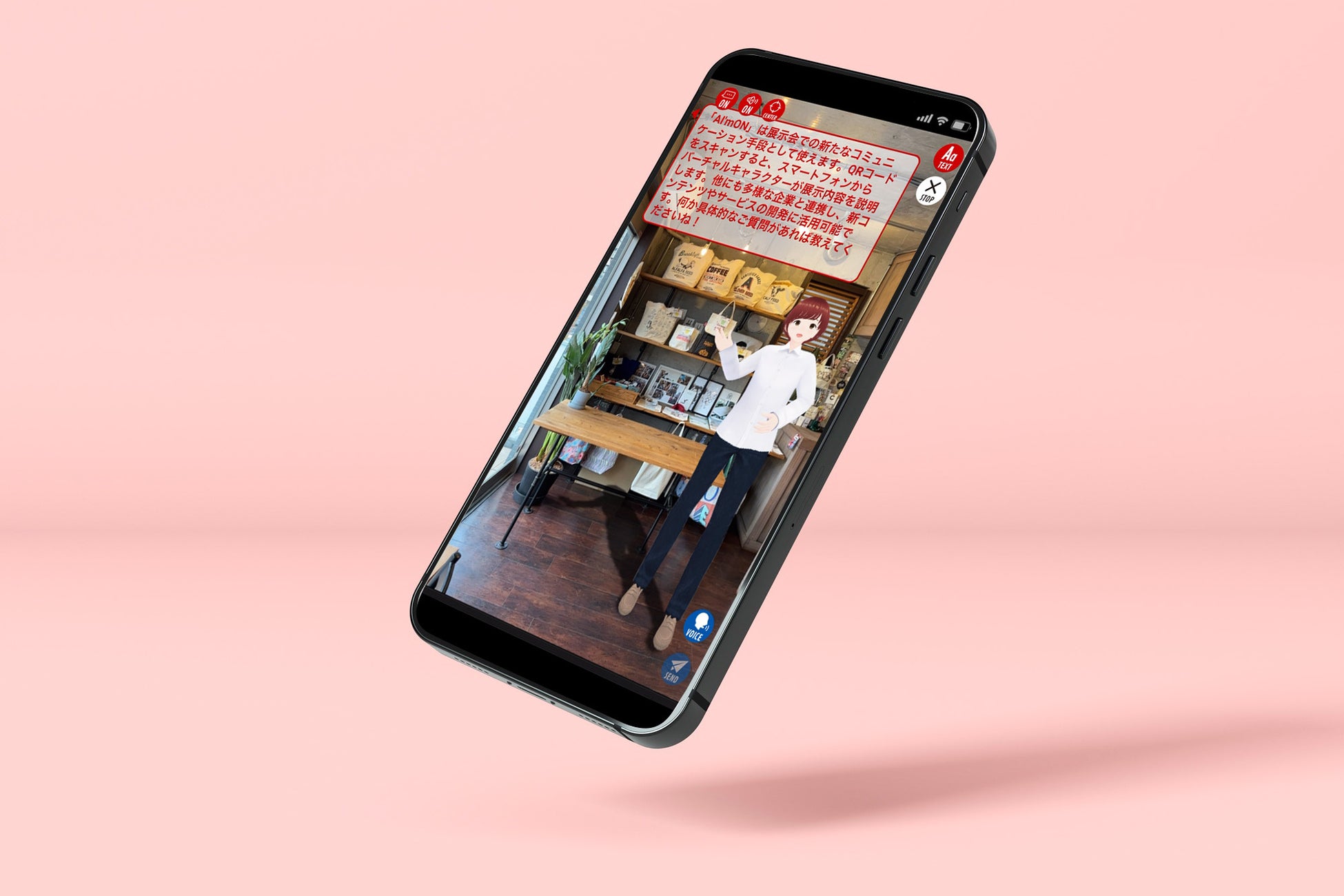 本サービスは、商品やサービスの情報をAIに学習させ、AR技術を用いた3Dキャラクターがスマートフォンのカメラ越しに説明や質問への回答を行う、他に類を見ない画期的なコミュニケーション・サービスです。