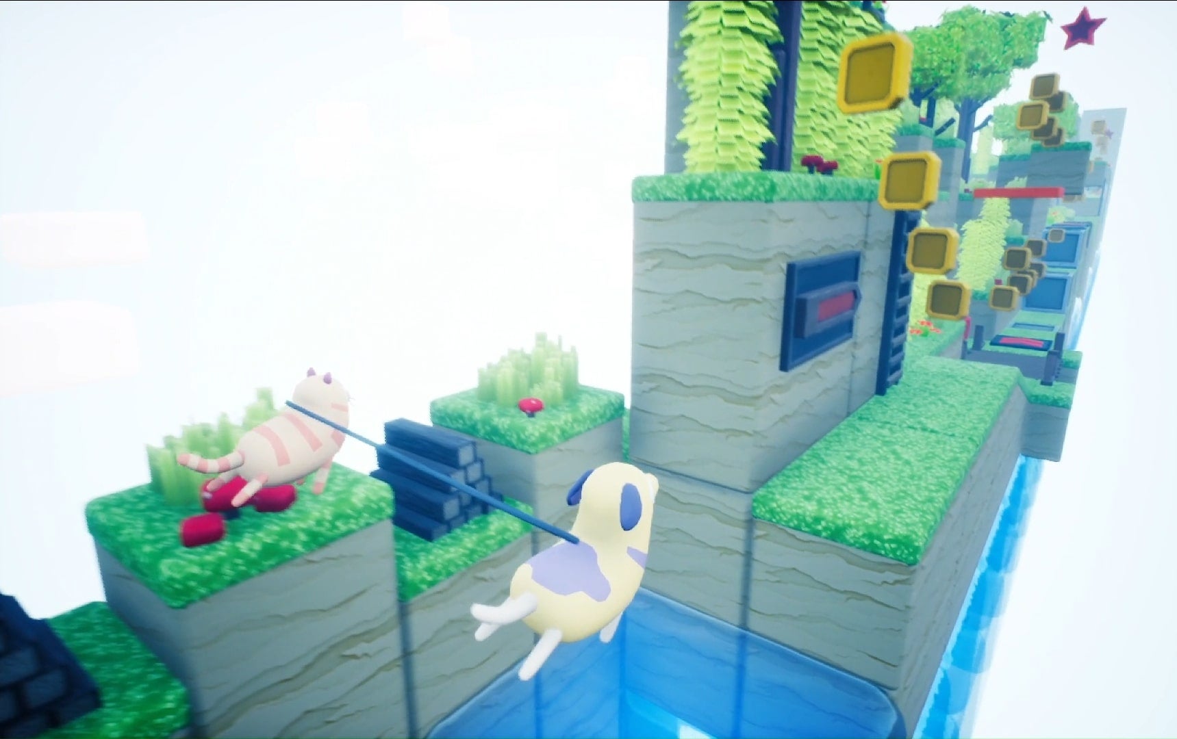 プレイヤーが動物に扮してプレイするジャンプアクション。最大10人の同時プレイに対応予定。移動とジャンプのシンプル操作ながら、ペット同士をつなげるハーネスを活用し、協力しながら困難に挑む体験ができる。