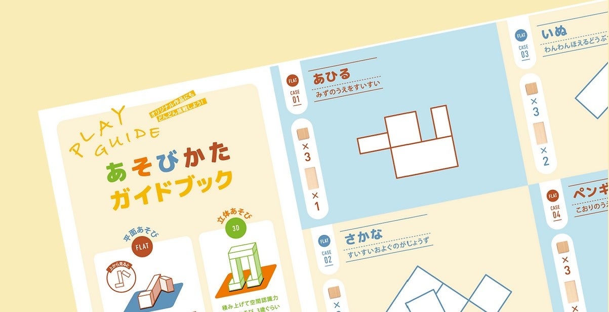 子どもは真似ながら、学びます。並べたり、ずらしたりしながら絵を描くように遊ぶ「平面あそび」14作と、積み上げられるようになる3歳ごろからの「立体あそび」16作の30作をあそびかたガイドブックにまとめました。