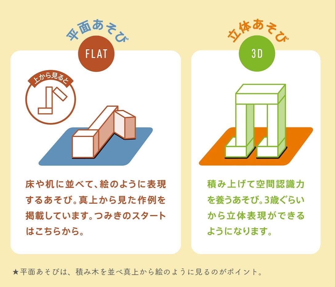 絵を描くように並べて遊ぶ平面あそびと、積み上げられるようになってからの立体あそび。発達に応じたあそび方ガイドで、保護者をサポートしながら、子どもの創造性を育む。