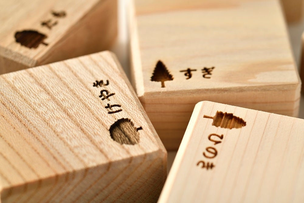 日本を代表する国産材を使って、子ども達に日本の木に関心を持ってもらいたいという意図があります。針葉樹の杉、檜。広葉樹の欅、たも。この4種類を採用し、木育ガイドブックで色や質感、重さなどを比較できるよう紹介しています。また、シルエットや樹種をレーザー印字したタイプもご用意しました。