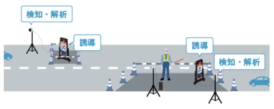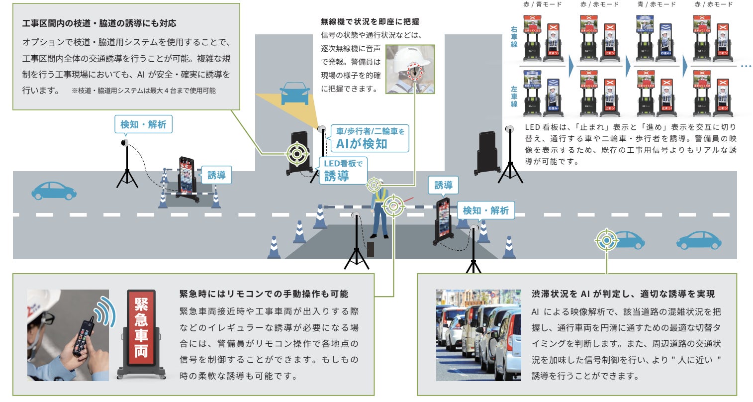 AIによる映像解析で、工事区間周辺の道路交通状況を解析し、AIが「今この時間で最適な誘導」を計算し、自動的に誘導します。工事区間周辺の通行に関する安全確認もAIが行い、安全が確認できた上で誘導を行います。