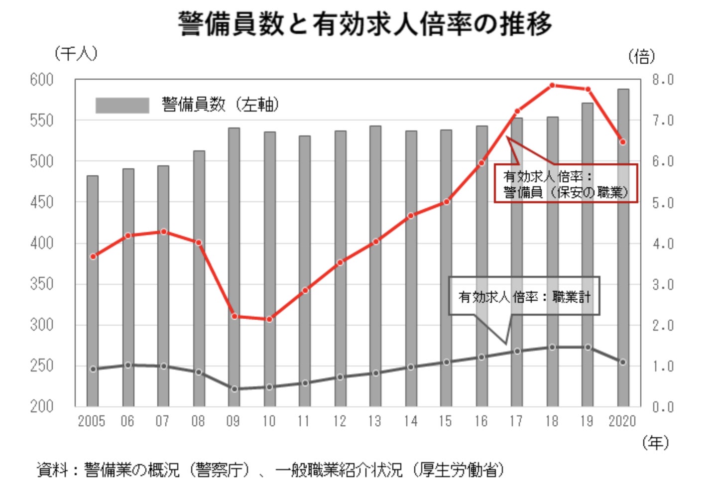 経済産業省によると、必要とされる交通誘導警備の業者数の推移は2008年以降増加傾向にある一方、職業別の有効求人倍率では全職種が1.0倍前後であるのに対して、警備員を含む保安の職業が大きく上回る状態が続いており、慢性的な人手不足に陥っています。