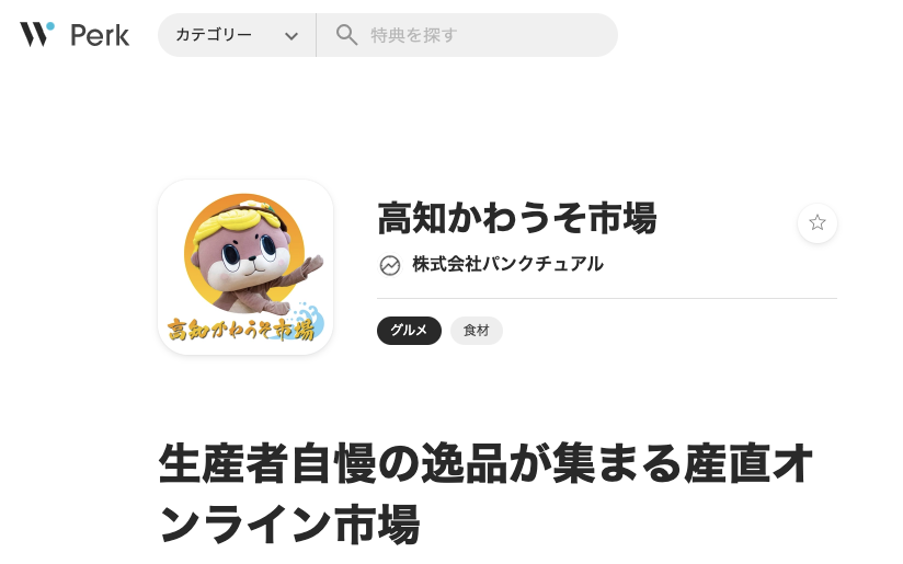 産直オンライン市場「高知かわうそ市場」を運営する株式会社パンクチュアル(本社所在地:高知県須崎市、代表取締役:守時健)は、ウォンテッドリー株式会社(本社:東京都港区、代表取締役 仲 暁子)が提供する福利厚生サービス Perkにサービス掲載パートナーとして参画し、会員を対象に、「高知かわうそ市場」の優待サービスを開始しました。