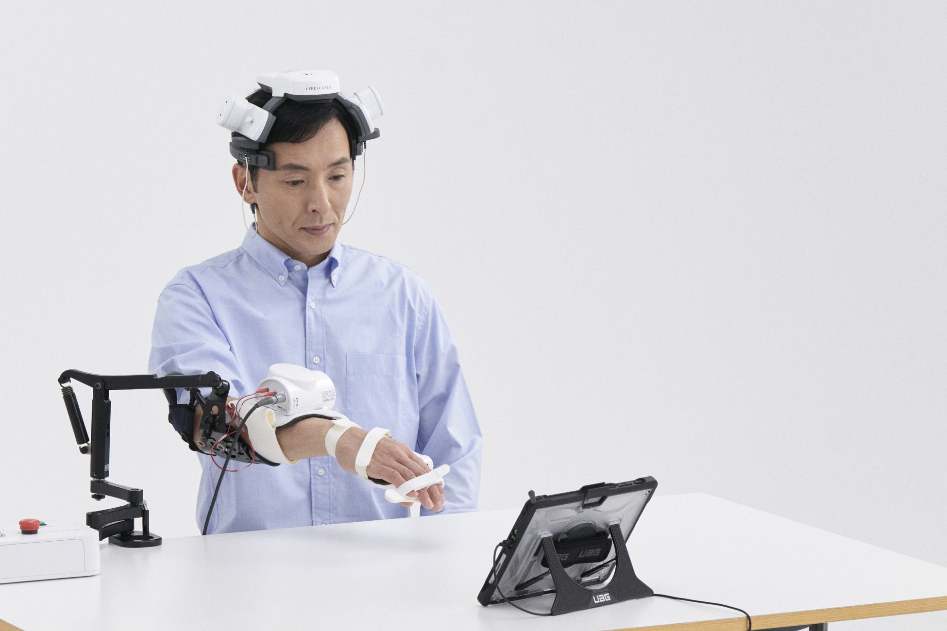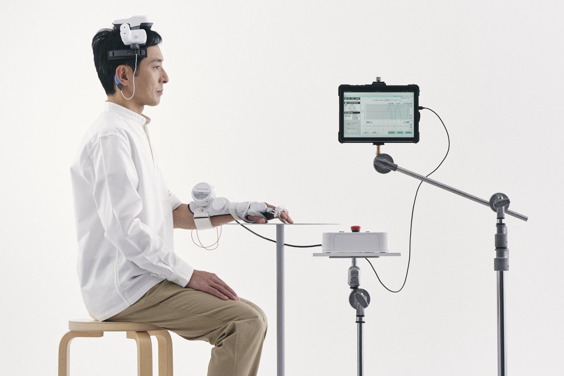 LIFESCAPES 機能訓練用BMIは、頭皮上から取得した脳波によって手指伸展のアシストと神経筋電気刺激によるフィードバックを行います。