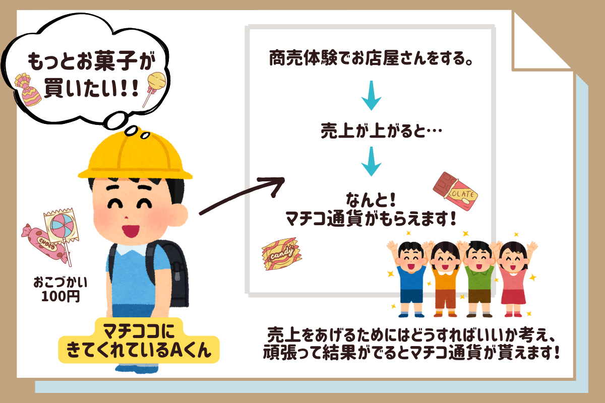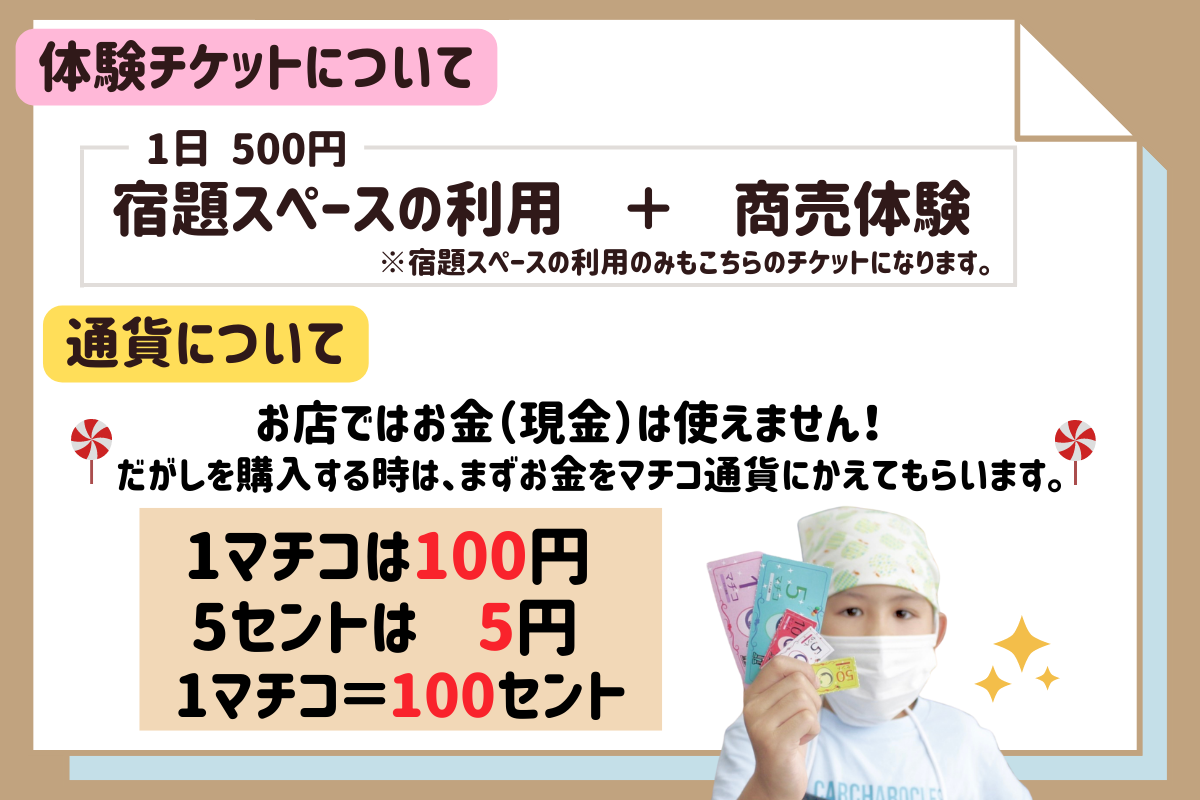 販売や商品の仕入れ、値段決め、集客など子供達がお店の運営をします。駄菓子屋のオーナーはMACHICOCOの代表。商売に必要な知識は現役商売人のオーナーが指導します。学校では体験できない、「リアルお店やさんごっこ」から社会を体験学習することができます。
