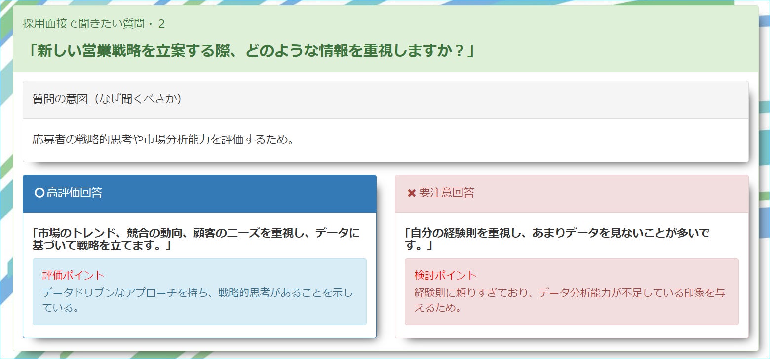 採用担当者の経験や知識に左右されない評価ポイントを提案し、客観的な判断基準に基づいた採用活動をサポートします。