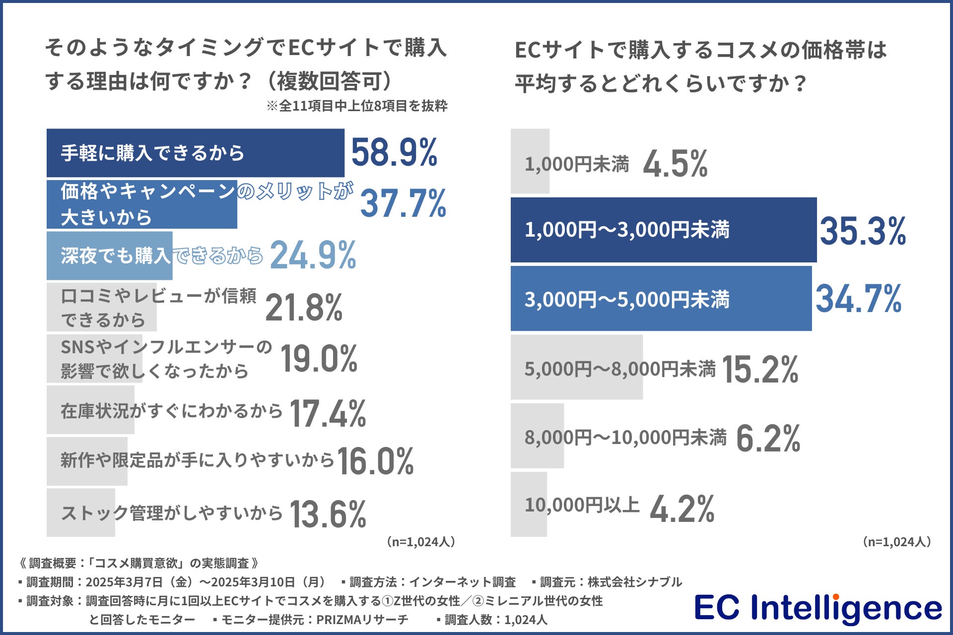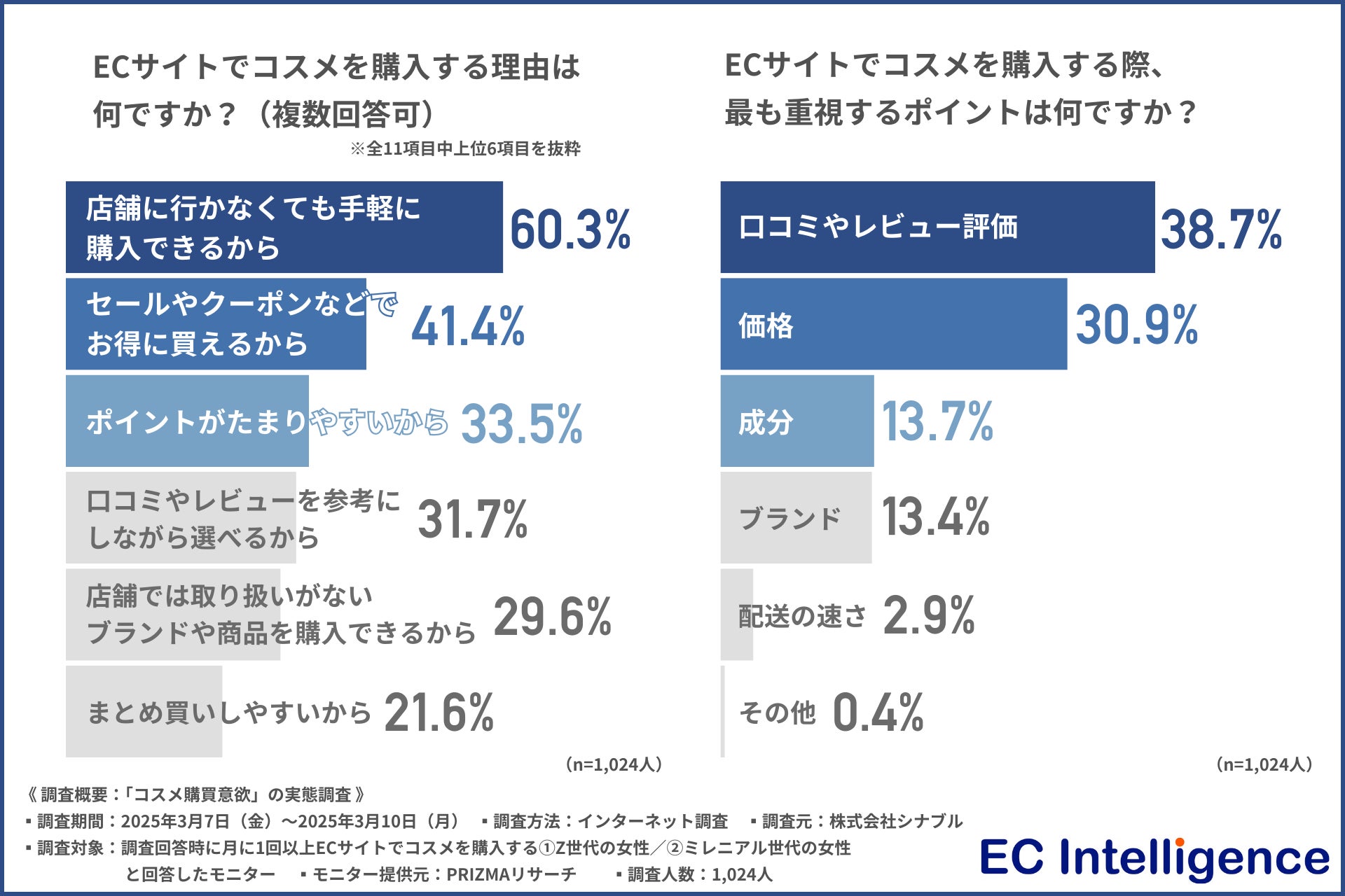 【コスメ購買意欲の実態調査】Z世代とミレニアル世代ではECサイトでの購入タイミングや購入アイテムに差があることが判明!購入する理由は「手軽さ」「お得感」「ポイントがつきやすい」