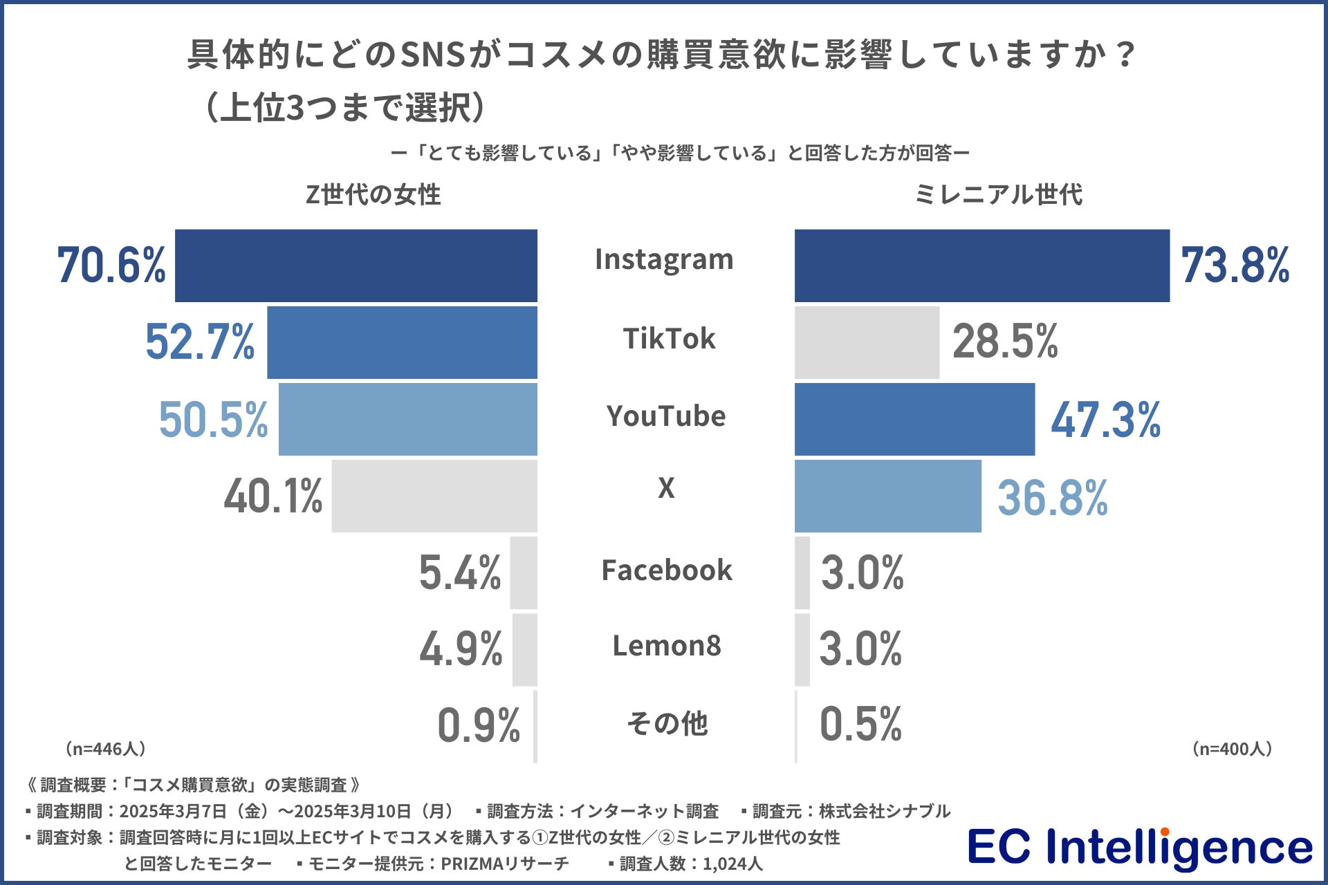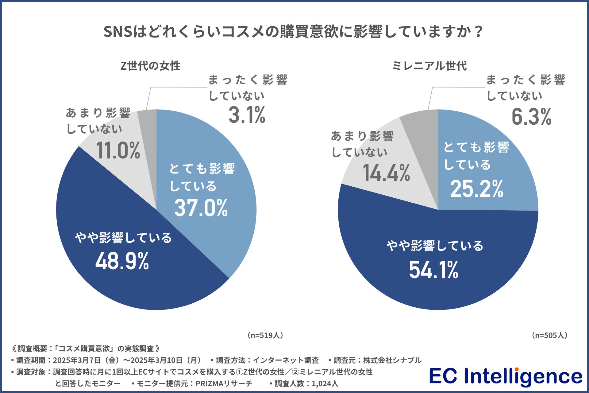 Z世代の約9割、ミレニアル世代の約8割の方が、SNSがコスメの購買意欲に影響していると回答しました。
