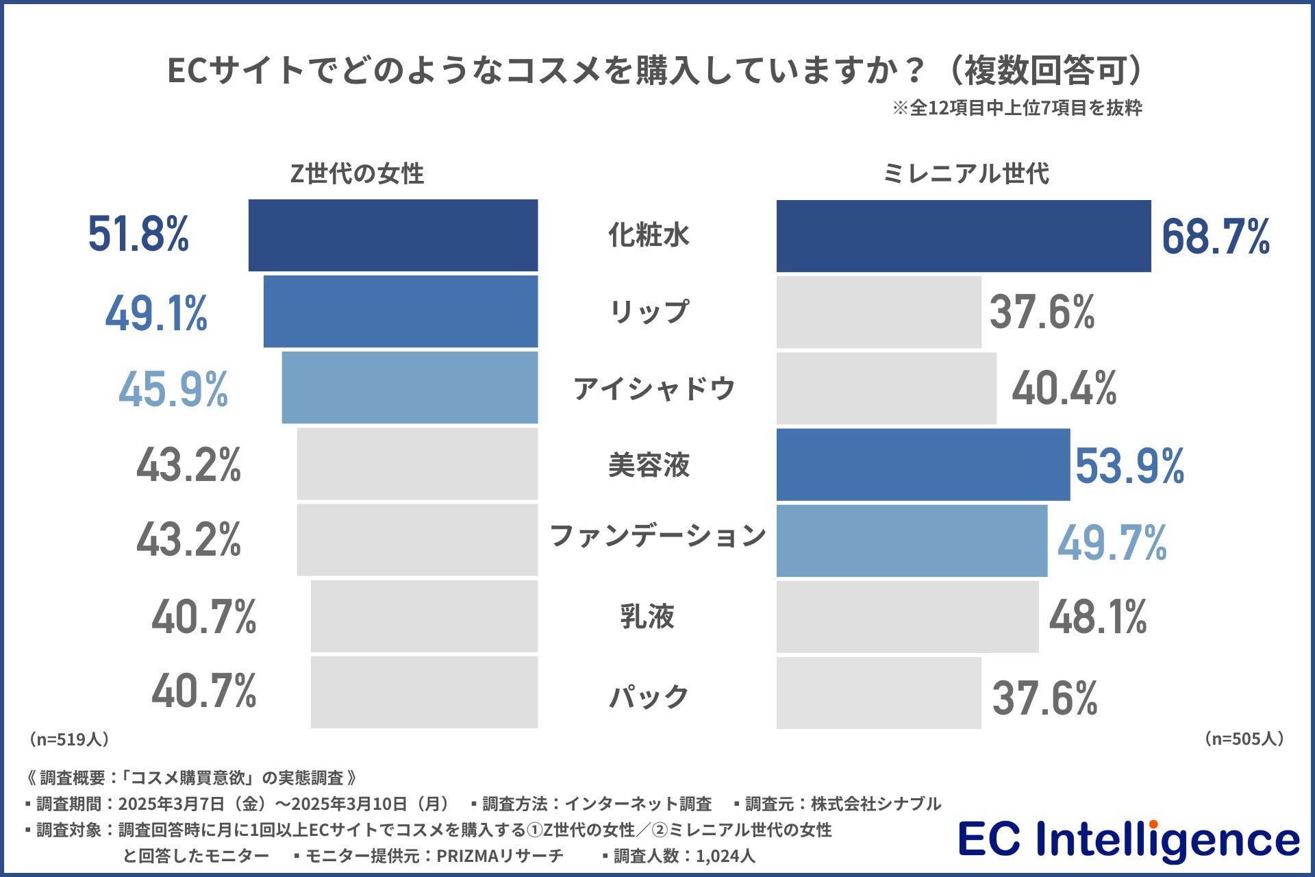 また、ECサイトで購入するコスメアイテムの種類に関しては、どちらの世代も「化粧水」が1位になりました。