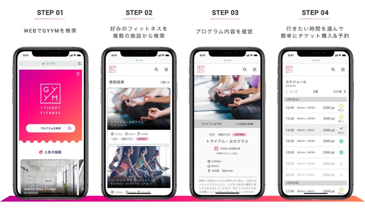 ・ ユーザーは、GYYMで「ジム等の検索」「予約」「決済」「都度利用」が可能。予約情報は、GYYMが予めジム等に共有するため、施設での入会手続き等は原則、一切不要。