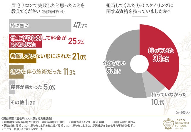 「眉毛サロンで失敗したと思ったことを教えてください(複数回答可)」と質問したところ、『特に無い(47.7%)』と回答した方が最も多く、次いで『仕上がりに対して料金が高く感じた(25.2%)』『希望していない形にされた(21.0%)』『痛みを伴う施術だった(11.3%)』『接客が悪かった(5.0%)』と続きました。