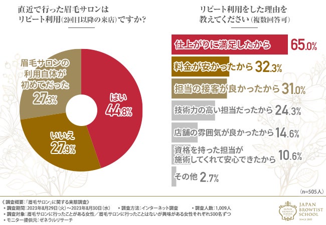 「直近で行った眉毛サロンはリピート利用(2回目以降の来店)ですか?」と質問したところ、『はい(44.8%)』と回答した方が最も多く、次いで『いいえ(27.9%)』『眉毛サロンの利用自体が初めてだった(27.3%)』と続きました。