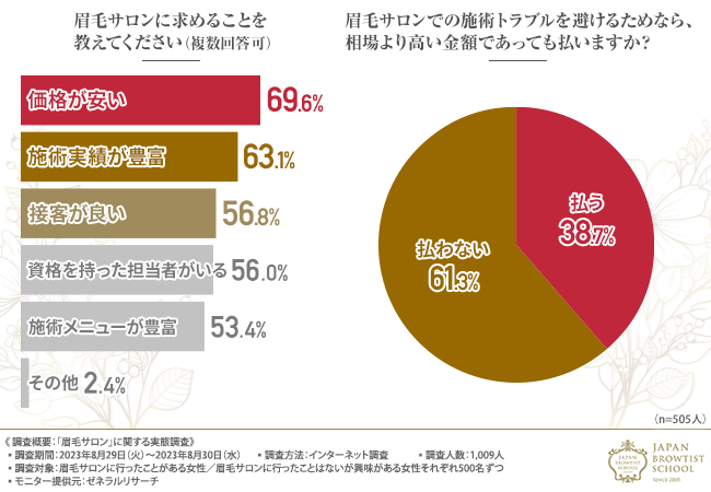 また眉毛サロンに行ったことがないが興味があるという方も、価格の安さを求めている方が多いものの、施術トラブルを避けるためなら相場より高い金額であっても払うという方が4割ほどいる結果もでております。
