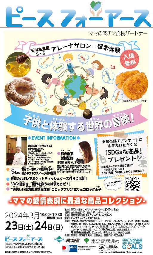地球温暖化防止活動や、環境教育・自然エネルギーの普及に取り組む特定非営利活動法人フォーエヴァーグリーン(東京都渋谷区、理事長:渡邊圭)は、2024年3月23日(土)、24日(日)、玉川髙島屋S・C 西館1F アレーナサロンにて愛を体感できるイベント「ピースフォーアース 2024 二子玉川」を開催いたします。ママの想いを伝える、お子様と愛し合うヒントが詰まった場所です。