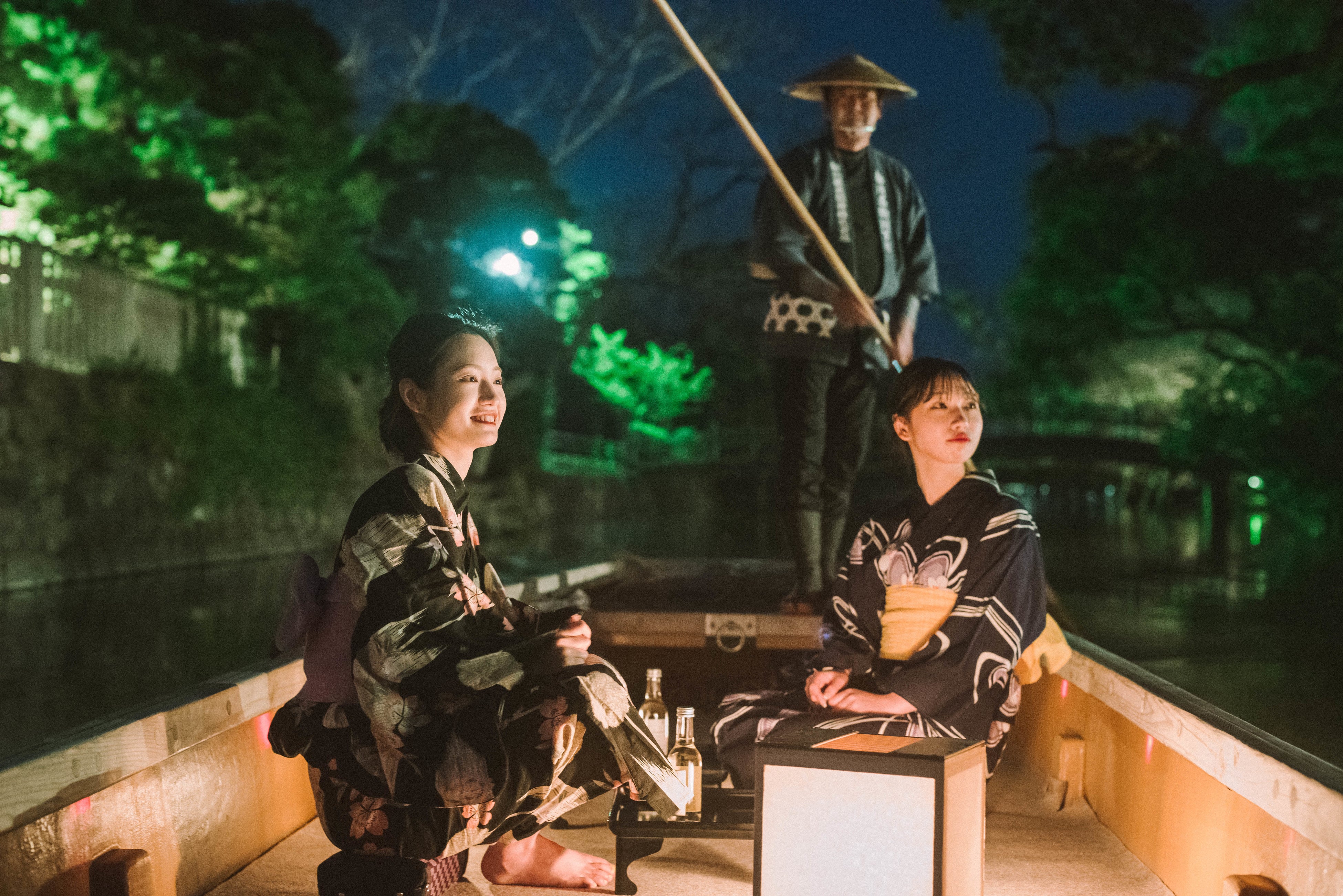 夜の柳川はお堀全体が水鏡となり、水面には美しい情景がひろがります。ゆったりと月明かりの中を進む舟に身を任せていると、まるで江戸時代にいるような、そんな心地がしてきます。
