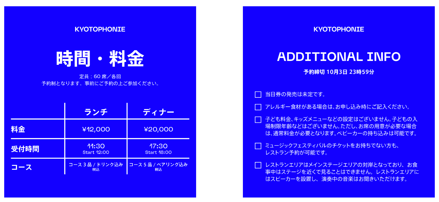 ランチ:12:00〜(受付11:30〜)12,000円(コース3品/ドリンク込み/税込込) 定員:60席/各回