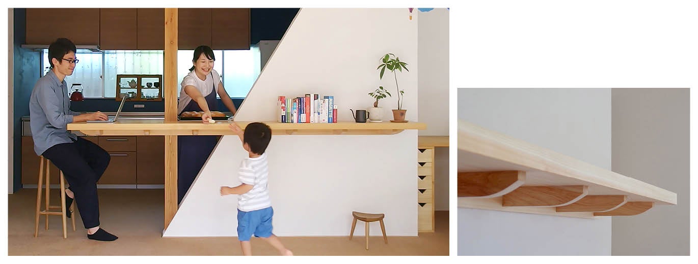 日本建築の伝統的技術である「舟肘木」をモチーフに、住まいの中心である家族のくつろぎの場所で建築と家具を一体化する実用性と日本の木構造の美しさを現代に生かした優れた作品である。舟肘木は日本の伝統的建築の中で住居系の建築、京都御所清涼殿、園城寺光浄院客殿等で使われ、寺社建築の斗栱とは異なる優美で品格のある構造意匠である。その美しく洗練された舟肘木をモチーフに建築と一体化したテーブルとして立体的に構成し、住まいの中心として家族が楽しく集まる美しい空間を作り出している。(堀越英嗣)