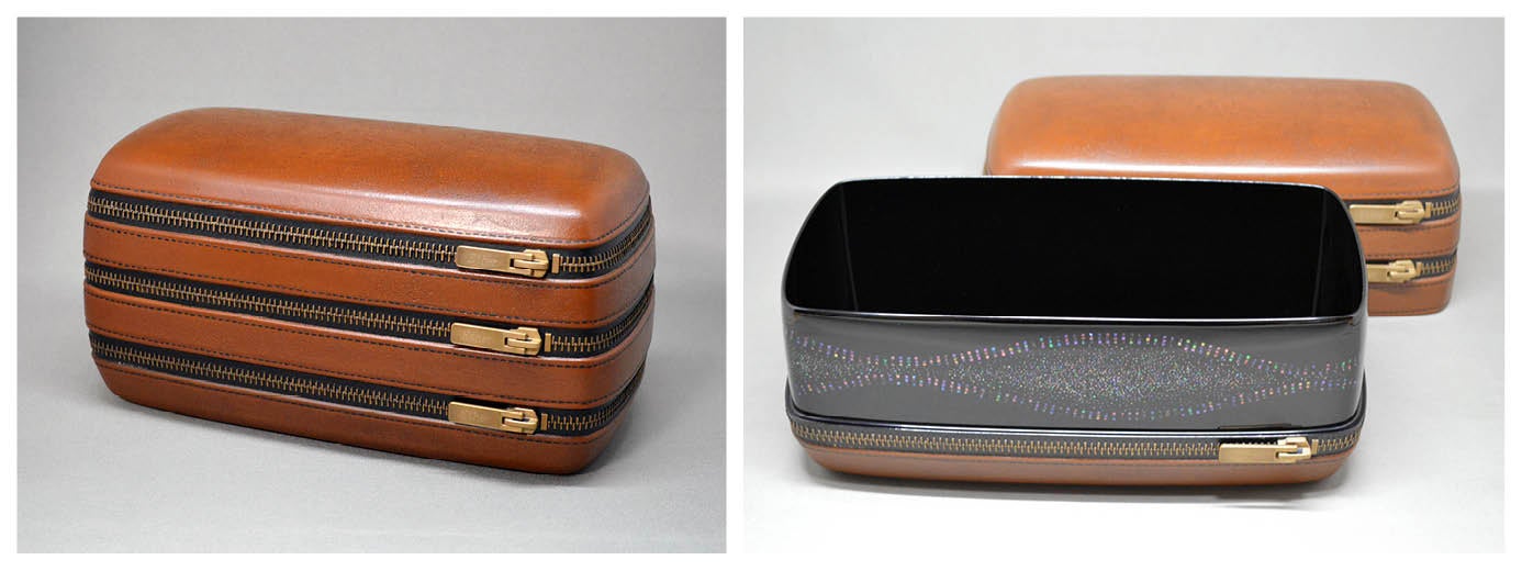 伝統と革新。和文化の精神と本賞のパーパスが形になって現れたような作品である。ファスナーは開かない。表面は革製品に見えて、革ではない。蓋を開けると、艶やかな漆が広がる。思い込みはあっさりと裏切られた。そして触れる人、使う人の想像力を広げるパワーに満ちている。作り手はこの様子を想像して、にんまりしているのではないか。多くの気配りを施しながら、見事な匠の技が軽やかに決まっている。楽しい驚きを受けた。(田中里沙)