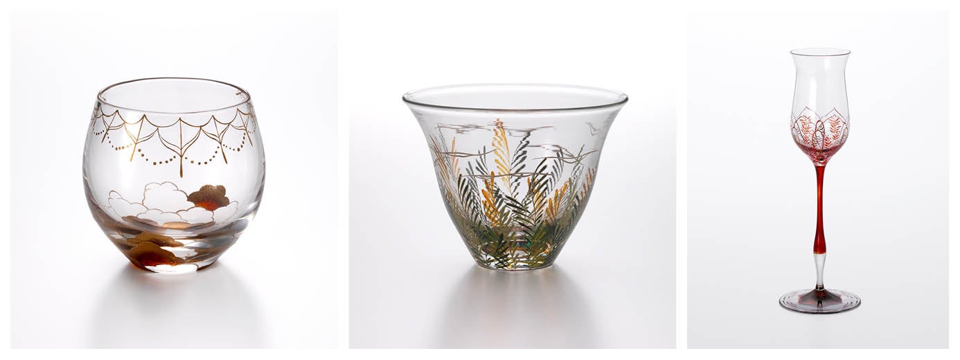 アールヌーボーの、植物に対する観察や繊細な造形化を透明なガラスの生命感と重ねていく精神との共通点をもっている。「和なごみ」では植物の線的な表現はよりライトだがそれがいくつものレイヤーや形の重なりあいによって、その場の雰囲気に浸透していくような共鳴を生み出している。漆や箔などの伝統技法をさりげなく幾重にもつかいながら、そこに「植物という生」のいきづかいをもたらす。現代的なエコロジーのとりこみといえる。(長谷川祐子)