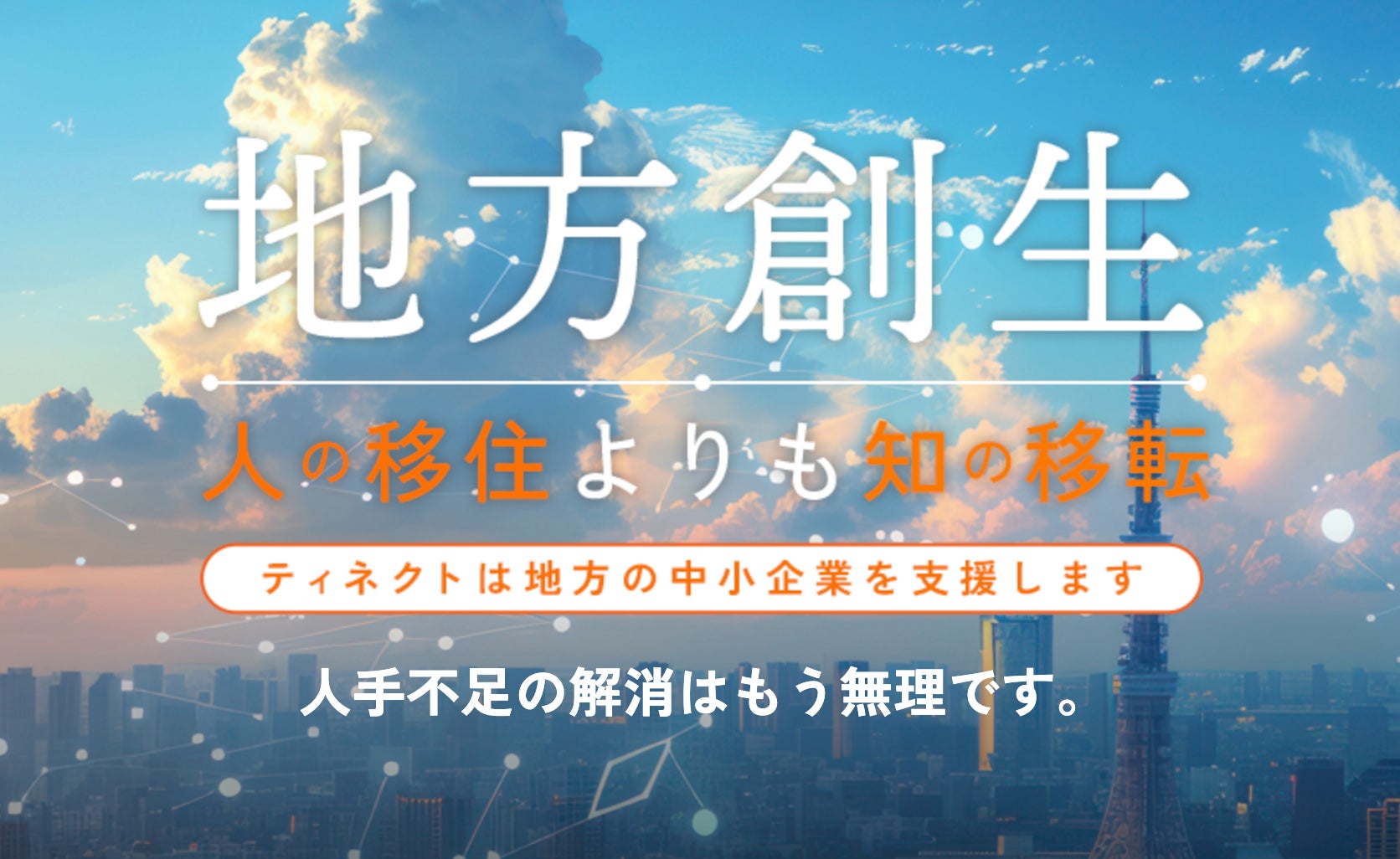 ティネクトは、人材不足に対する新たな解決策として、「人の移住」よりも「知識の移転」に注力しています。都市部にはマーケティング、IT、デザイン、ファイナンスなど、幅広い分野で経験を積んだクリエイティブ人材が数多く存在していますが、地方ではこれらの専門スキルが不足しています。
