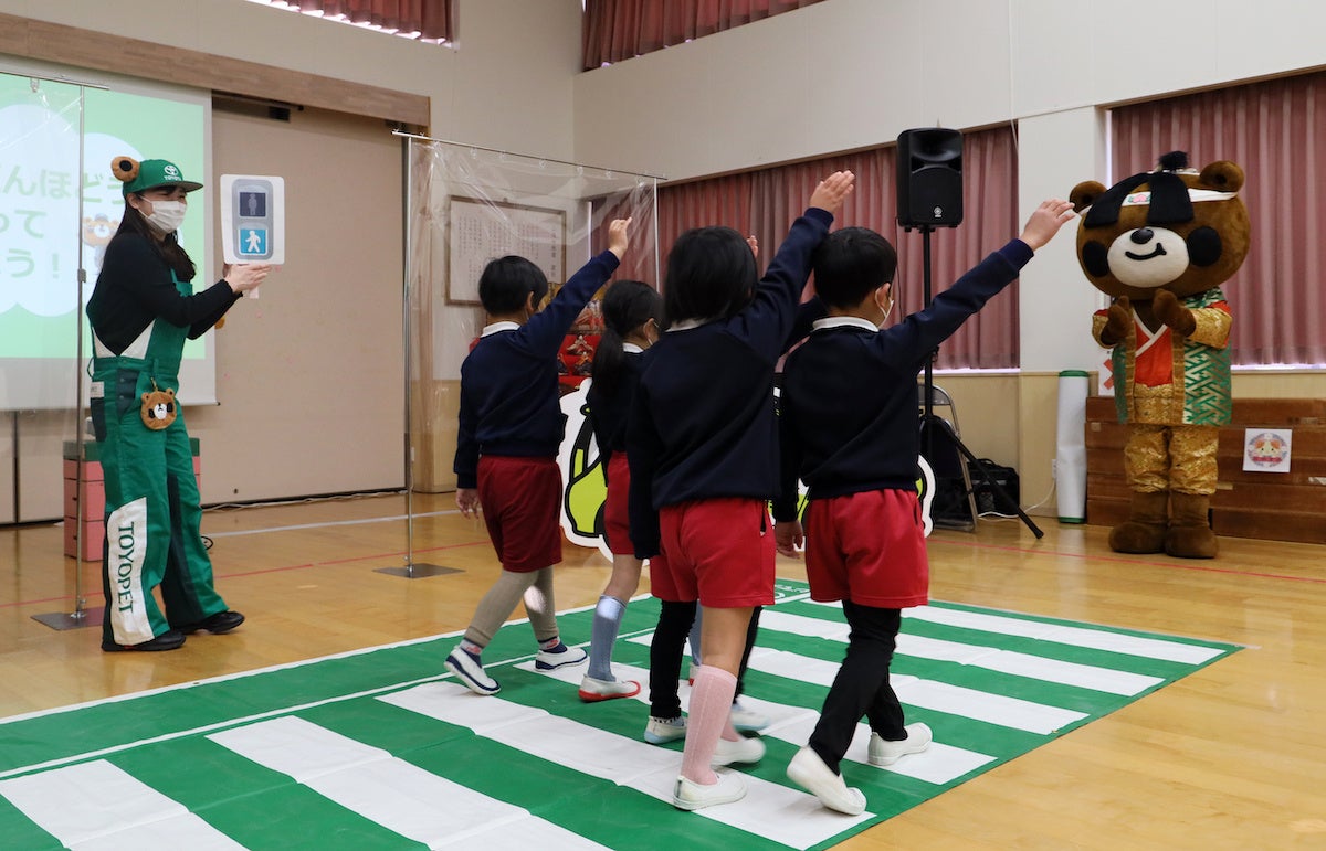 岡山トヨペットは、2014年9月から開始して以来、137回(2023年5月9日現在)交通安全教室を行っています。交通安全教室では園児に紙芝居を用いて交通安全について楽しく分かりやすく伝えています。その後、紙芝居で学んだことを復習するためのクイズや、横断歩道を渡る練習、さらに岡山トヨペットキャラクター・くまるの「交通安全音頭」を園児と一緒に踊るなど、小さい頃から交通安全に対する知識が身につくよう学んでもらっています。